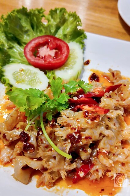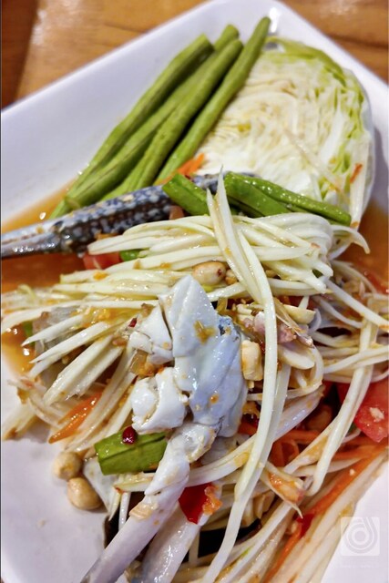こっちは生のワタリガニを使った「ส้มตำปูม้า(ソムタムプーマー)」。生のカニを使うものなので新鮮さが問われる料理です。これがおいてあるってことは鮮度に自身があるんでしょうね。