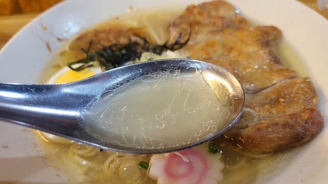 壁に貼られたメニューとにらめっこしてチキンが乗った塩らー...