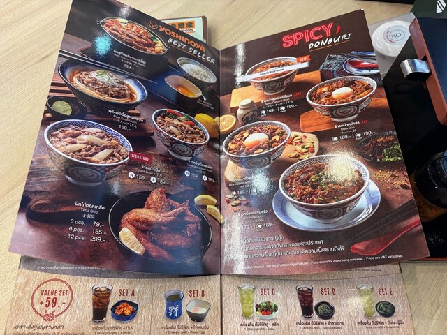 牛丼は並が159Bとかつやのカツ丼と同じ。日本円で800円位ですね。