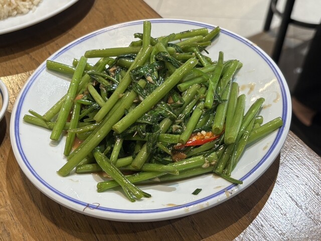 左からカオマンガイ、フライドチキン版のカオマンガイ、空芯菜の炒め物