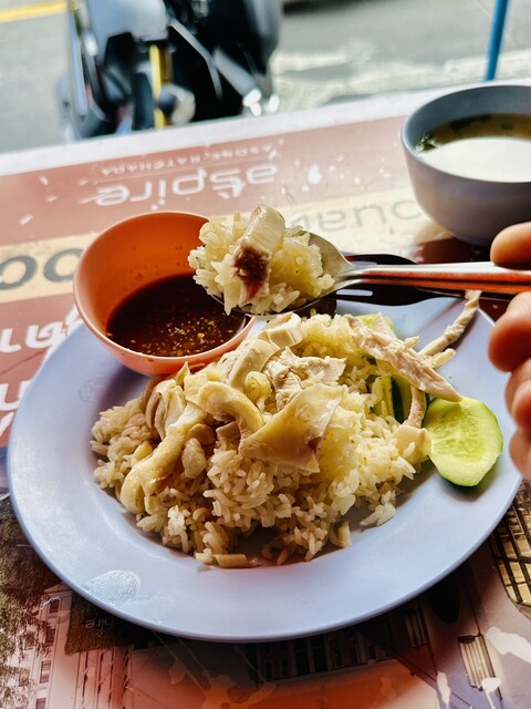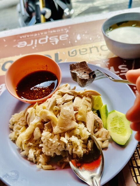 先ずは、蒸し鶏を食してみるとパサついた食感!もも肉を使用しているから、しっとりとしているのかと思いましたが想像と違いました〜血合の塊は見た目から抵抗があると思われます!何の血合?かも分からず食してみると、臭みなどもなくゼラチン質で何とか食べれましたが、揚げ鶏と蒸し鶏のカオマンガイの方が美味しいと思います。