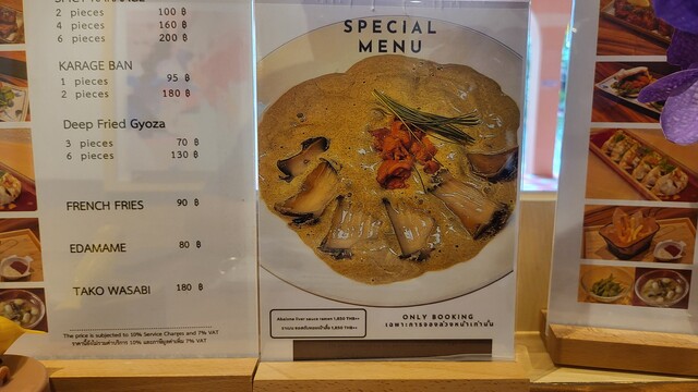 Shoyu Shio Konbusui Tsukemen(Egg) 380THB, Oyster 400THB, Dip Souse 650THBx3 (VAT, サ料別)