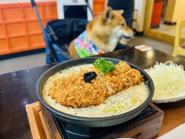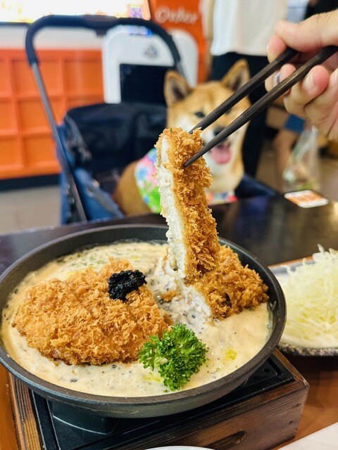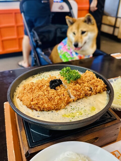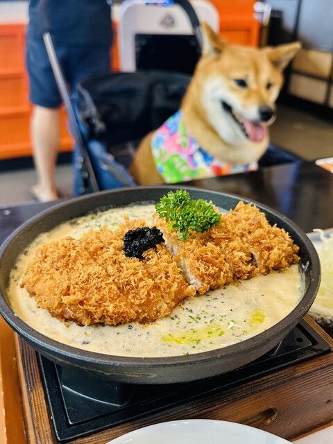 店舗は、ペットと食事ができるテラス席に、店内テーブル席などカジュアルに利用できます!ペットは、ペットカート(無料レンタル)に入れ、飼い主の横に座らせる事もできます〜メニューは豊富!日本のメニューにない限定メニューなどもあり!頂いたのは「黒トリュフクリームソースカツ定食」です。