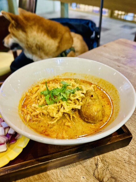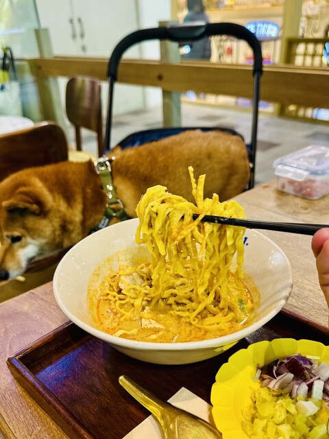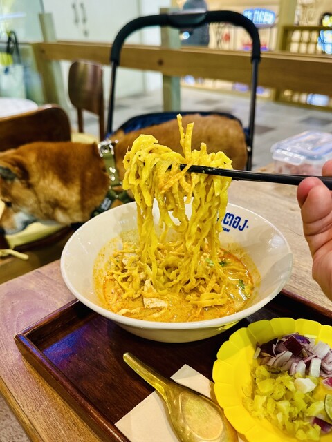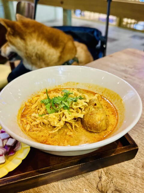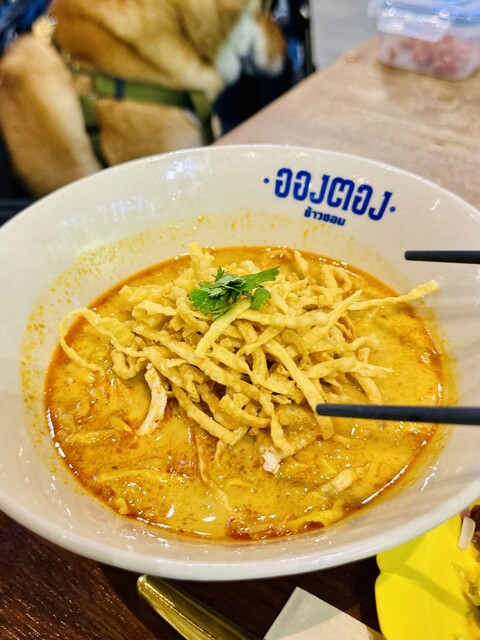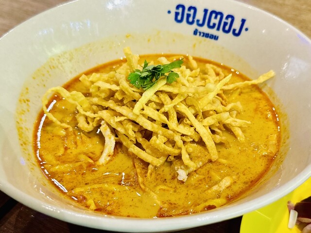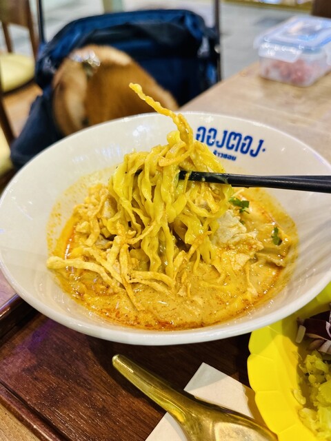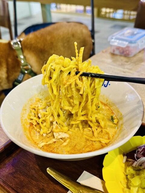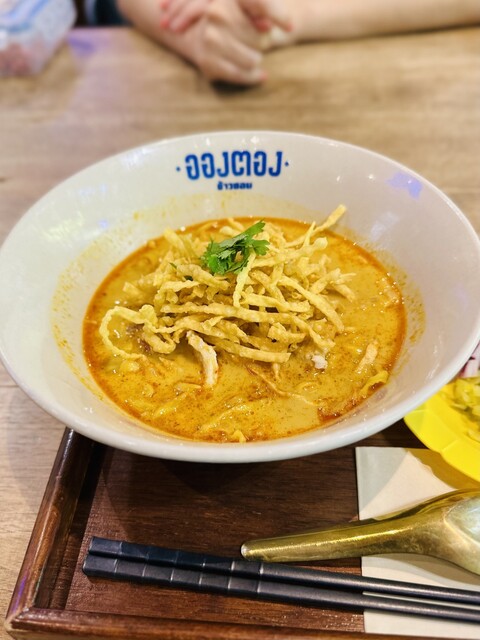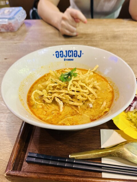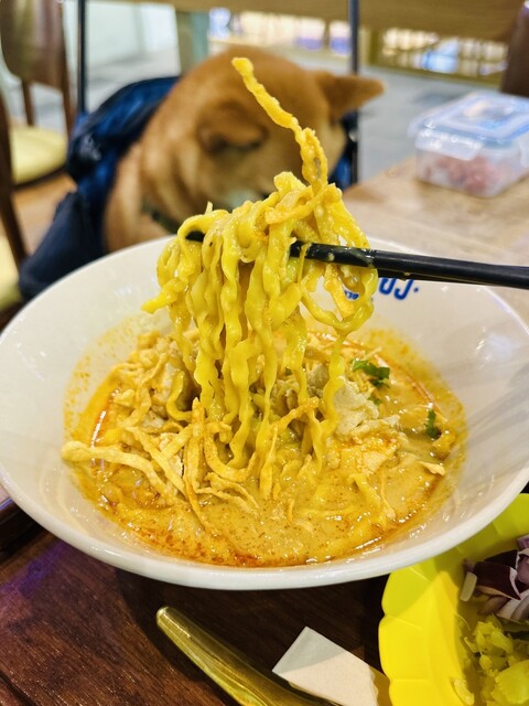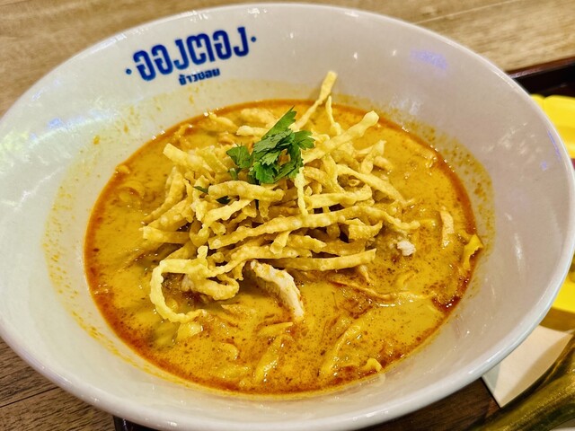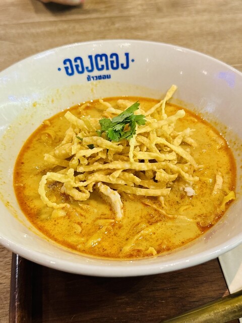 頂いたのは、定番の「チキンカオソイ」です!先ずはスープから〜美味しい♡スープの濃厚さが半端ない!まさに「やみつきになる美味しさ」とはこのこと!辛さはしっかりあるのに、独特の甘さも絶妙に調和していて、もう箸が止まらない!あっという間に麺が消えていきます〜そして、主役のチキン!手羽元が丸ごと1本入っていて、これがまた驚くほどホロっホロに柔らかい♡味もしっかり染み込んでいて、噛むたびに肉汁と旨みがじゅわ〜っと広がる♡カリッとした揚げ麺の食感も最高!大満足の一杯でした。