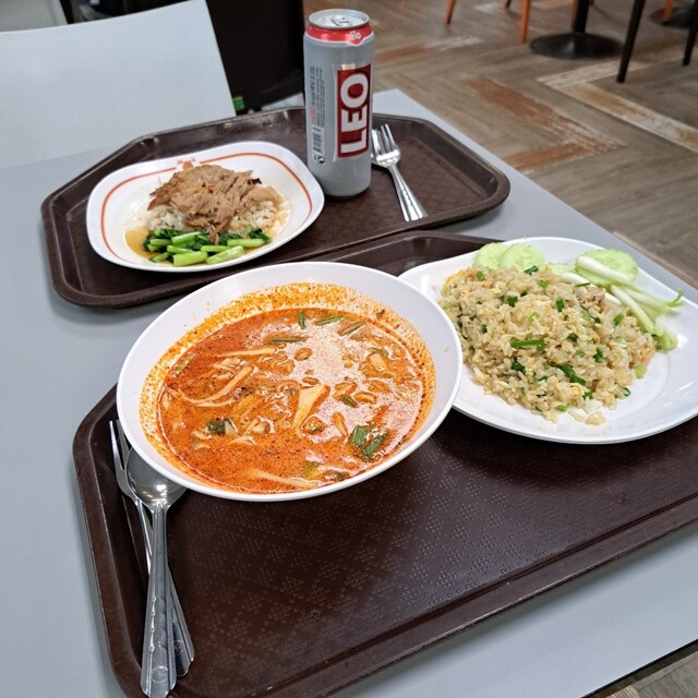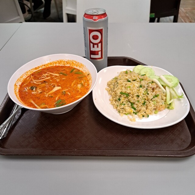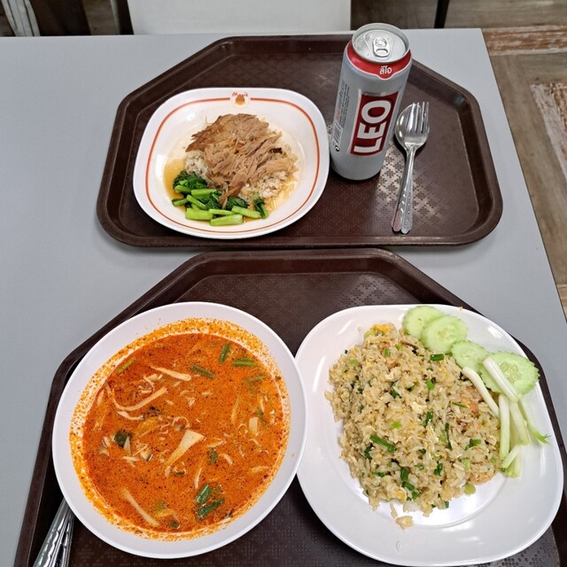 カオカームー(奥)、LEOビール、トムヤムヌードル(左)、カオパッド(右)