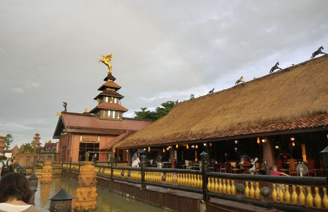 ということでテラス席横を更に奥へと進んでいきます。スコールが止んだばかりとあって、背後にはL'Arc~en~Cielが。その後、奥のレストランスペースへと移動しました。