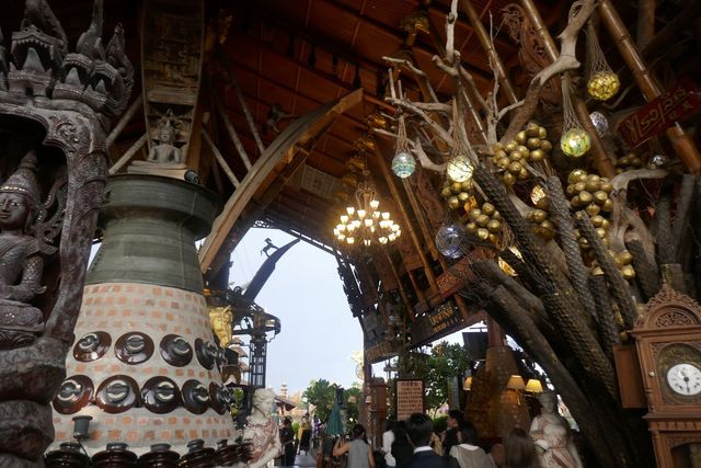 雑多なお土産屋のようなエリアを抜けていくと、スワンナプーム国際空港へ着陸態勢に入ったタイ国際航空のboeing-777シリーズの飛行機を発見!飛行機が見えたエリアには開放的なテラス席が、奥まったエリアにはステージなどが設置されていました。