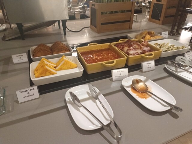ベーコンや目玉焼きなどのおかず、パン、サラダ、チーズ、お粥、スイーツ、ジュース、シンハービールやコーラの入った冷ケース、ハーゲンダッツなどが入ったアイスの冷ケース。