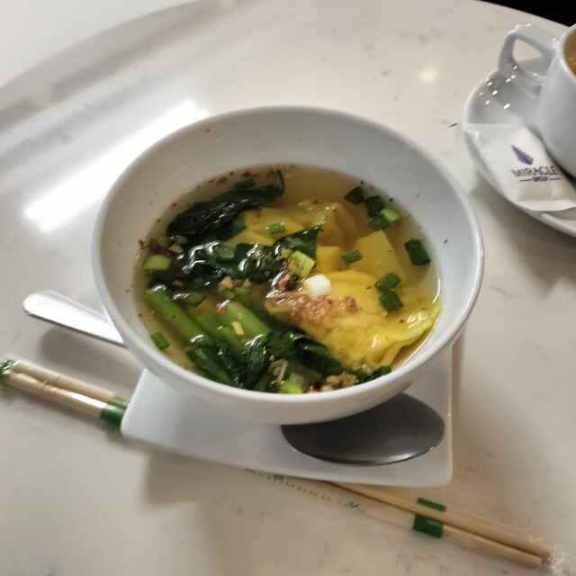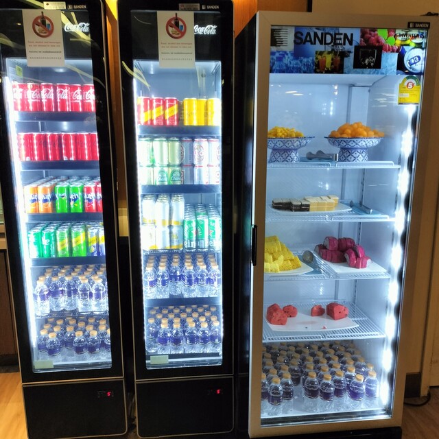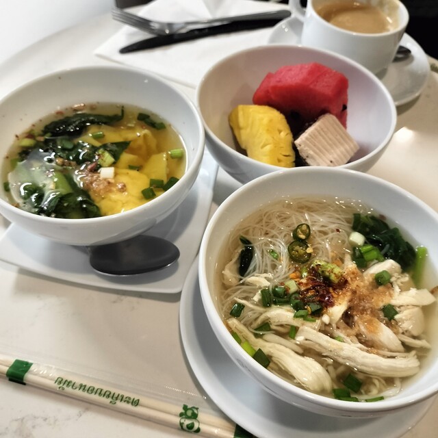 入り口のきらびやかさはファーストでもビジネスでも似たようなものでありますが、やはり、ファーストクラスと名乗るだけあって室内の設えはこちらの方が重厚でソファーもいい。そして何よりもお料理の種類が多い。フルーツやおつまみの乾き物までこちらの方が若干種類が多いのが面白い。でも、それくらいなら大したことない。ホットミールはアラミニットで作ってくれるサービスがあるのだ。まるで航空会社のラウンジみたい。。。は言いすぎ?でも、提供されるヌードル(春雨みたいな麺)は美味しいし、ワンタンスープは絶品。カオマンガイも頼めば作ってもらえるらしいのだが残念ながら10時からなんだって(´;ω;`)そういう意味ではさすがファーストクラスと名乗るだけのことはある。。。ただ、航空会社のファーストクラスラウンジと比べたら全くの別物。ファーストクラスやビジネスクラスに乗るお客さんは航空会社のラウンジ使えるから、そもそもこういう有料ラウンジには来ないんじゃない??自社ラウンジのない航空会社向け?いや、自社ラウンジなくてもアライアンスや提携航空会社のラウンジを使うでしょ?LCCとか??そもそもファーストクラスとかビジネスクラスあるか???だからミラクルの中でファーストクラス、ビジネスクラスと名乗ってるにすぎないんだと思う。実際ファーストクラスで国際線載ってこのラウンジだったらお客さん怒っちゃうもんねwwでも、エコノミークラス&プライオリティパスで利用させていただくには十分満足で、ビジネスクラスラウンジに比べてもかなり上質でした。