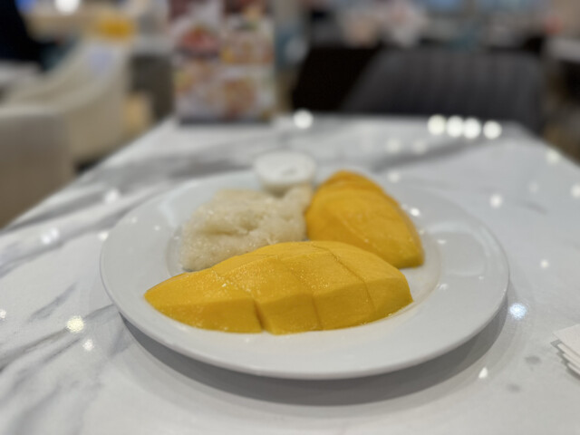 カオニャオ・マムアンとは“もち米とマンゴーのココナッツミルクソースがけ”のこと。カオニャオがもち米、マムアンがマンゴーという意味で、英語だと「Mango sticky rice」。このカオニャオ・マムアン、ココナッツミルクソースを染み込ませた甘いもち米だったり、ココナッツミルクで炊いたりするらしく、熟したマンゴーとの相性がピッタリ。