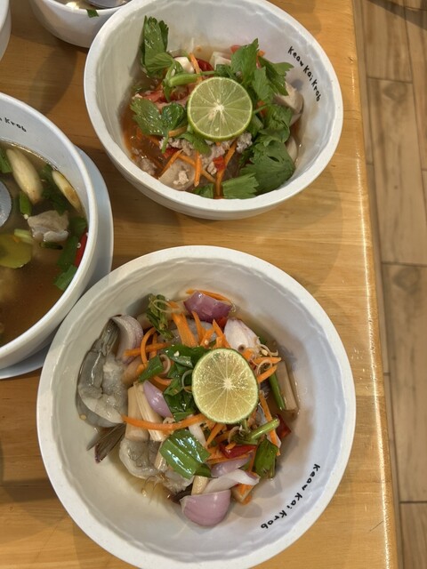 SPICY LOTUS ROOT SALAD WITH FRESH PRAWNS 186バーツ、SPICY GLASS NOODLE SALAD WITH MINCED PORK 85バーツ
