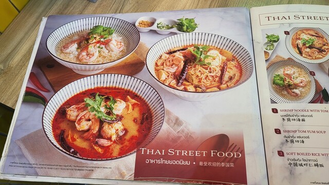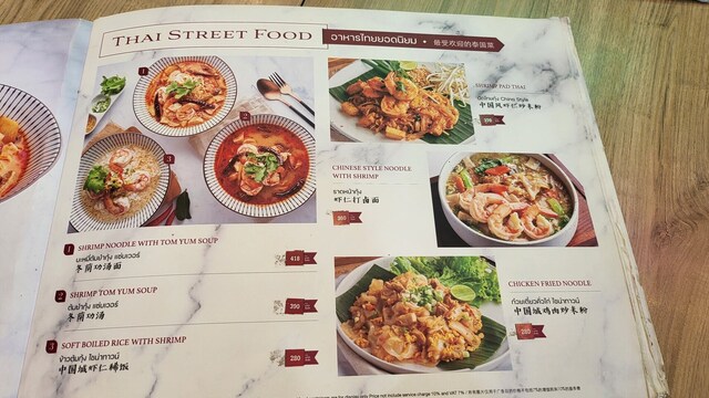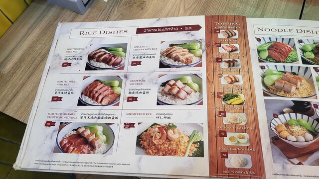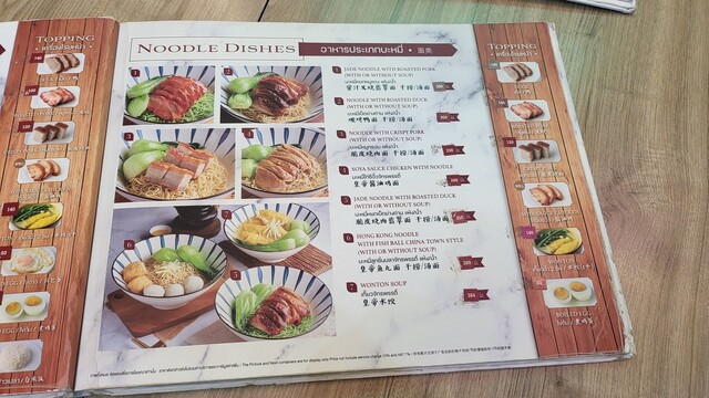 HONG KONG NOODLE WITH FISH BALL CHINA TOWN STYLE 280THB, Crispy pork 120THB, Mango L 190THB (VAT, サ料別)