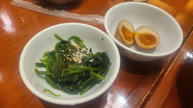 麺の上にはチャーシュー、角煮、長ネギ、メンマ、海苔と玉子がついてないのでほうれん草と共に追加。