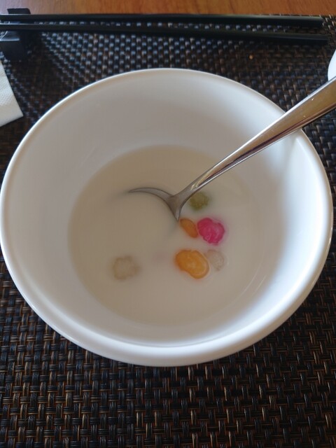 タイのデザート。甘い液体に、カラフルな小さい白玉みたいなんが入っています。