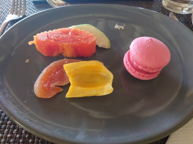 マカロン食べてみた。たしかベリー系。お皿にちょっとだけ、はまった砂糖と塩とチリのフルーツのためのスパイス。