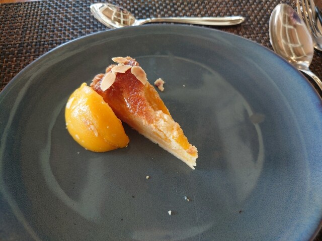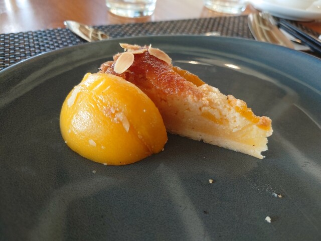 もともとホールケーキに乗っかっているピーチが、取る人がいなくて残されていて、あと3切れくらいだったので、しめしめ、いただきます。