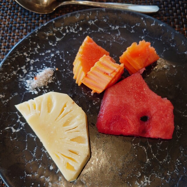 最初の朝ごはん。フルーツに謎のトッピング。