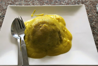 やっと登場。かぼちゃの黄色いソースを被った、何だ、これ?