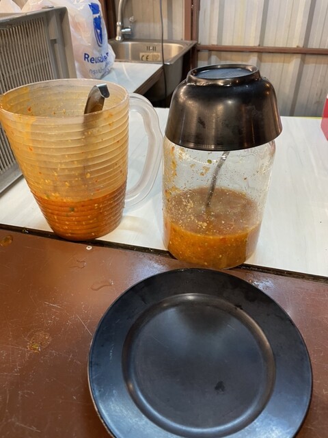 そして、つけるタレが2種類あって、どっちがどっち(焼肉用なのか鍋用なのか、はたまたそう言った区別はないのか)かはわからないのだが、タレカウンターでニンニクや唐辛子などを入れて自分で作る。このタレが元々辛いのだが、めちゃめちゃ癖になってうまい。じゃんじゃん食べてしまう。笑