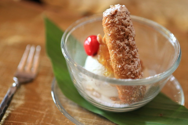 バナナを揚げて、ココナッツミルクのアイスクリームと一緒にいただくスイーツです。