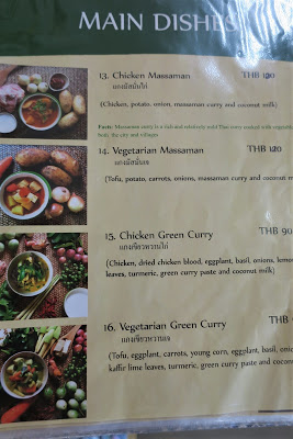 メニューは、マッサマンカレーやグリーンカレーといった一般的なものと、民族の名前が入った料理もある。カレーは、ベジタリアン向けもあり。