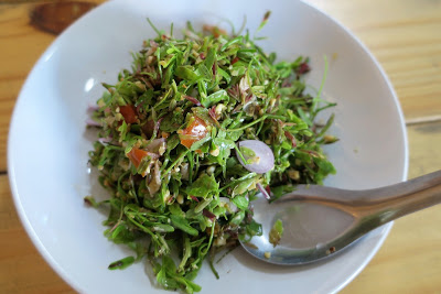 で、登場~タマリンドの葉+ミニトマト+玉ねぎ+ピーナッツが細切れでミックス。ニンニクが効いて、味付けは、さっぱりしている。