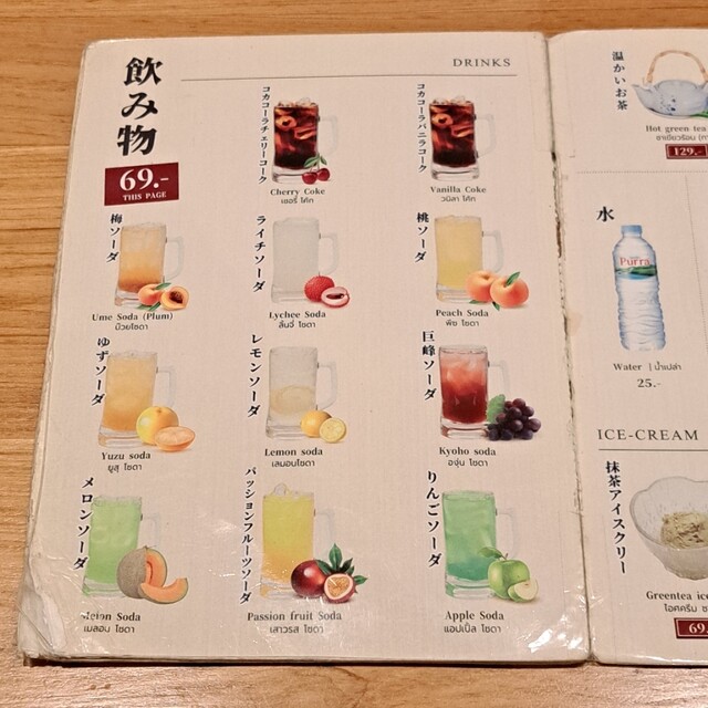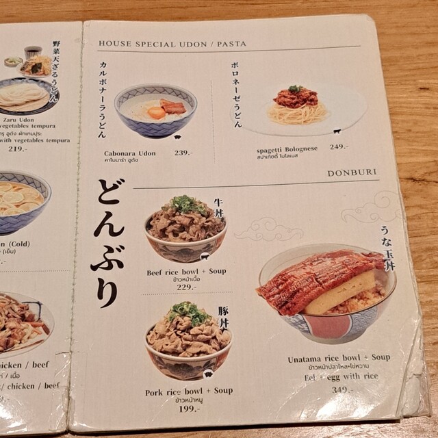 早速入店ですが、お店入口横にメニュー表が置いてあり、見てみると「かけうどん 179฿」~に始まり、「牛肉の温玉うどん 249฿」まで、色んなうどんメニューがあり、サイドメニューのご飯物や、「豚カツ」等の揚げ物まで充実しています(2025年11月23日時点で、1฿約5円)。
