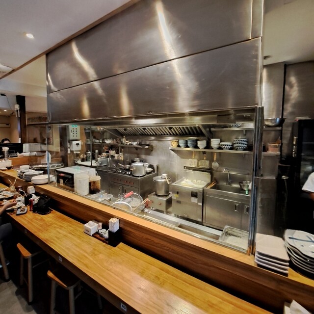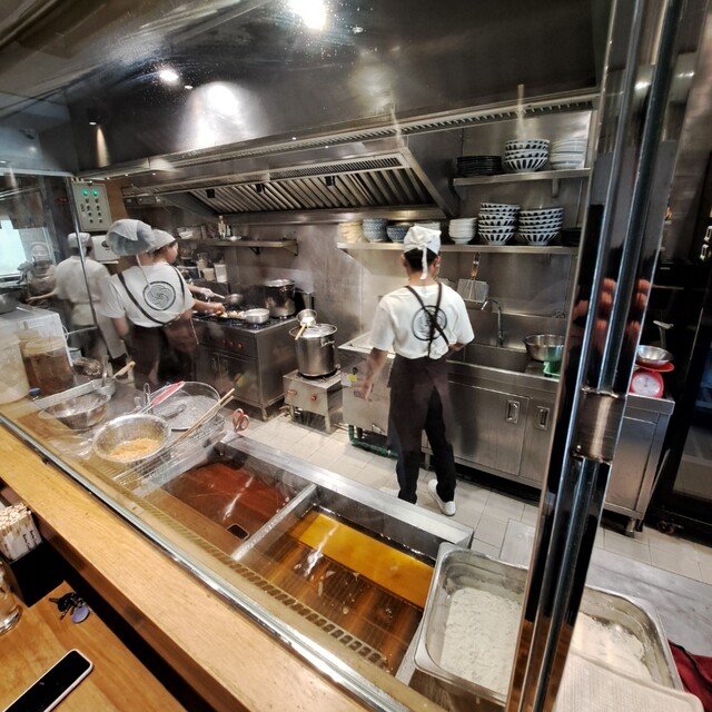 取りあえず中に入って決める事にし、入店。右側はガラス越しにうどんの生地を打ったり、天ぷらを揚げたり、麺を茹でる作業場が見られます。結構本格的ですね〜。従業員の接客も笑顔で丁寧です。