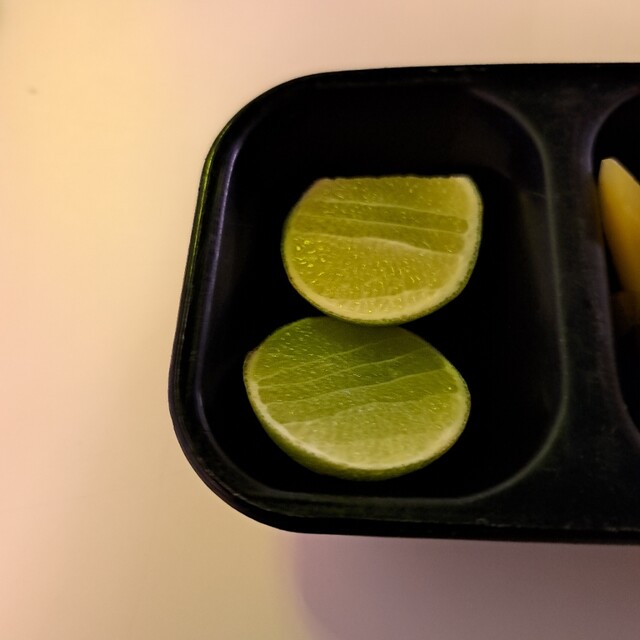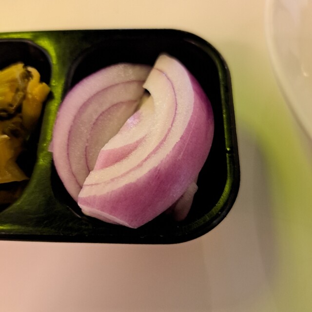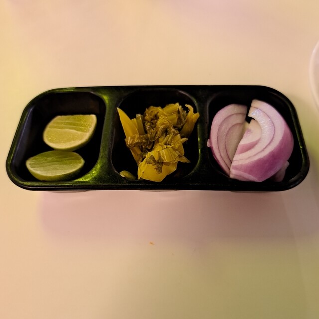 骨付きのチキンは肉がホロホロに柔らかく、お箸でも簡単にはほぐせます。これがまた旨く、カレースープの風味も良く染みてます。薬味に用意された「ライム」「玉ねき」「漬物?」も入れて味変です。