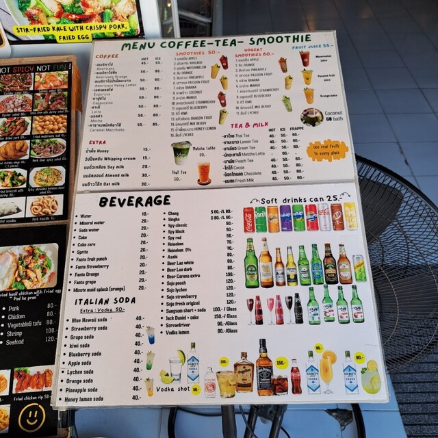 空いてる席に着き、メニューを見ますが、とにかくカオソーイが美味しいお店と言うことで、私は「カオソーイ(チキン)」、相方が「チキンウィズフライドエッグパッカプラオ」、それと何か野菜物が欲しかったので「チャイニーズブロッコリー」を注文。