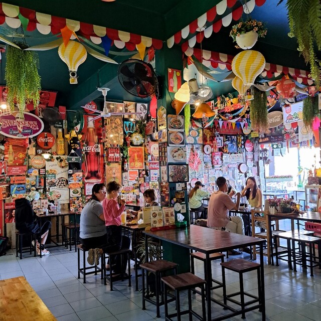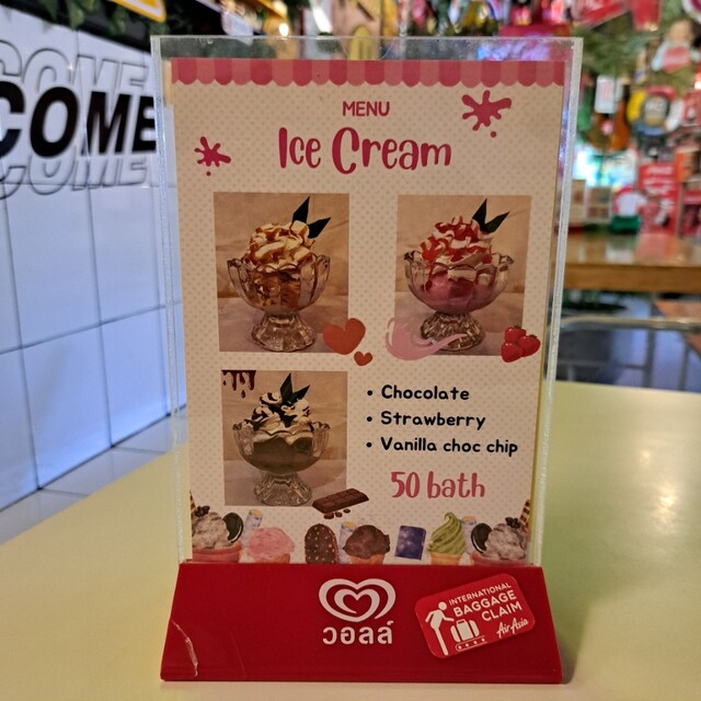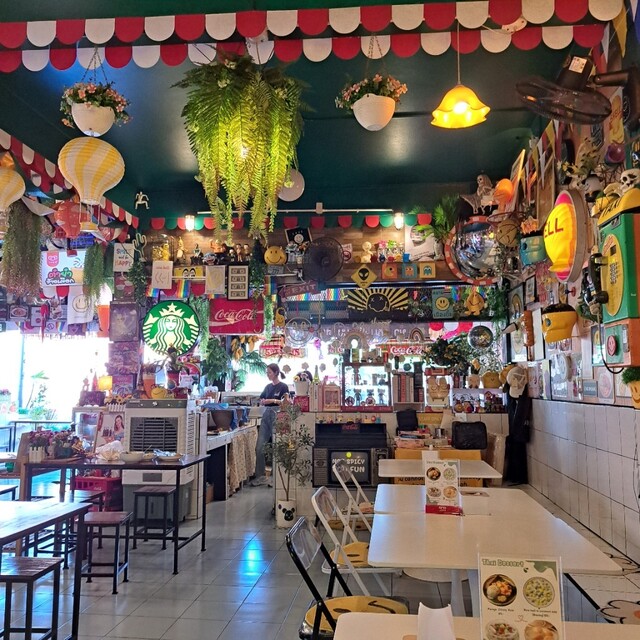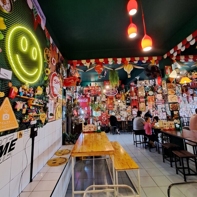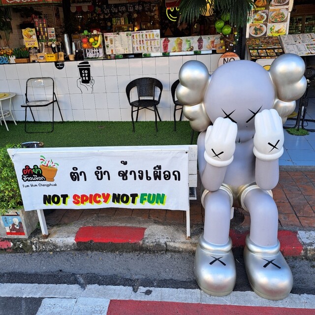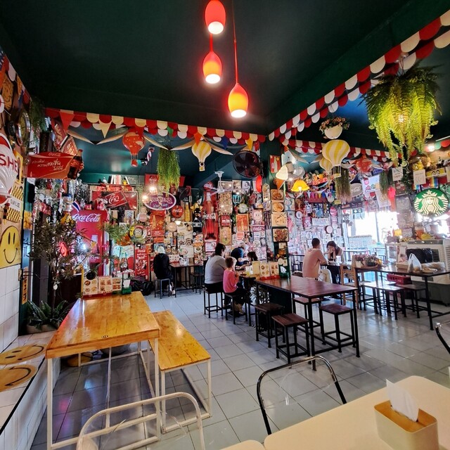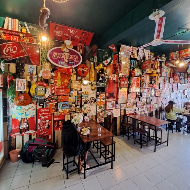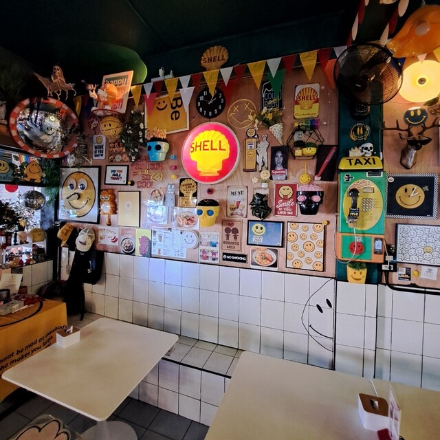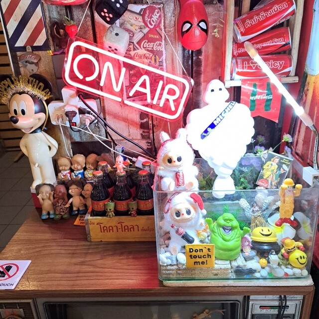 ここはタイ国チェンマイですが、中に入ると何となくアメリカンっぽい?雰囲気で、壁の一面に色んな物が飾られています。こういうゴチャゴチャした雰囲気…、結構好きです。また、日本では今、流行ってる?「ラブブ」も置いてました。