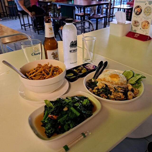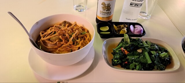 カオソーイ(チキン)、チャイニーズブロッコリー、チキンウィズフライドエッグパッカプラオ、SHINGHA ビール