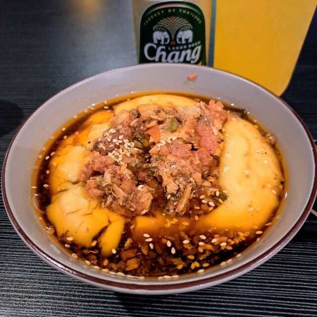 相方と恐る恐る箸を付けますが、スープは全然辛くなく、むしろあっさりし過ぎではないかと思う程、コクが少ないスープです。麺の上にはミャンマー風の豆腐とチキンがのっています。麺も中華麺風で美味しい一杯でした。