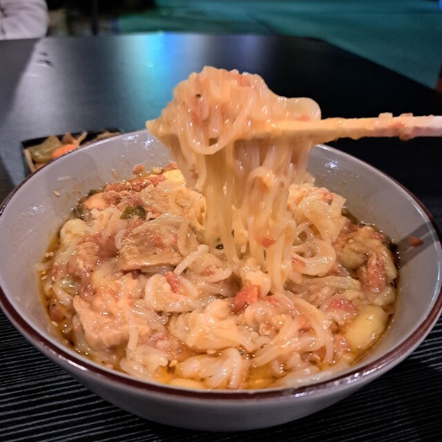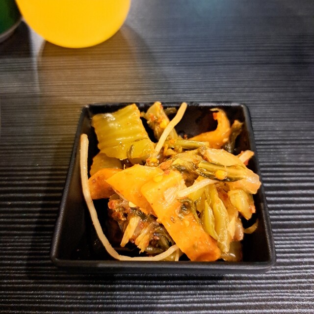 さて、料理が出来るまでの間、お店の中を見てる内に、最初に「SHAN NOODLE」が来ました。それと一緒に漬物?の様な物も小皿に入って出てきました。