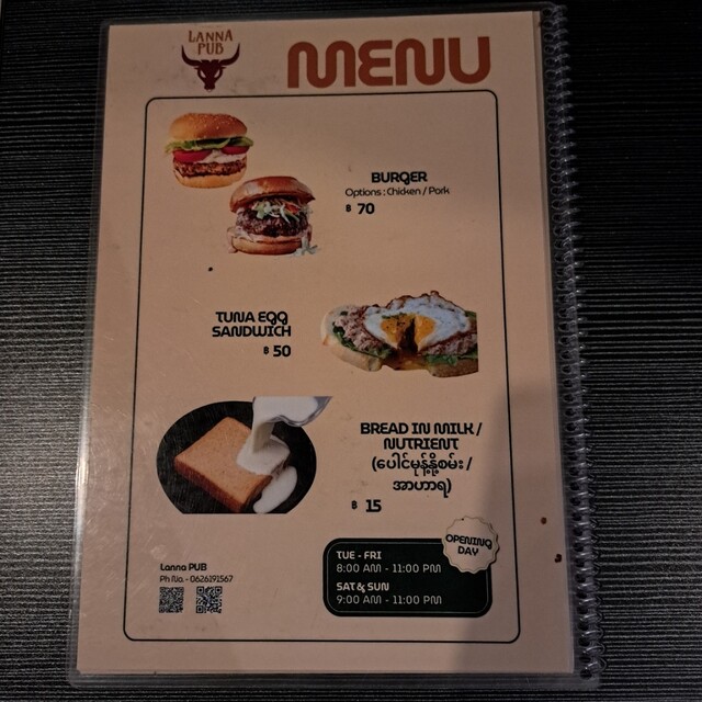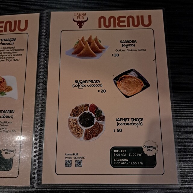 門の右側に大きなメニュー看板が掲げられていますが、よく見ると、どうやらミャンマー料理を出すみたいです。また、お店の名前に「PUB」と付いてるので、レストラン+パブのお店だと思います。