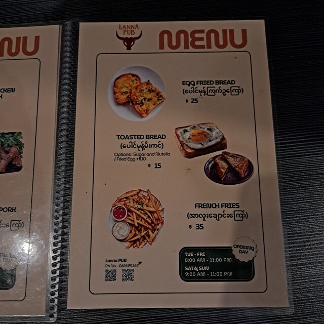 お店の方がメニュー表を持って来てくれたので、スマホの翻訳アプリを使ってタイ語で会話しようとしましたが、タイ語はダメみたいで、聞くとミャンマー人で英語かミャンマー語しか話せないとの事。