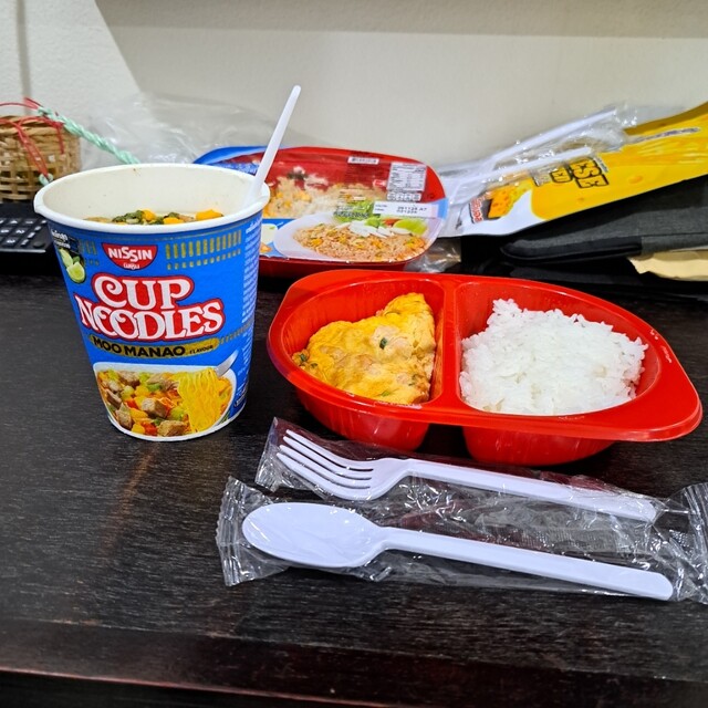 取り敢えず、セブンイレブンのコンビニ弁当とカップ麺を食べて一安心です。