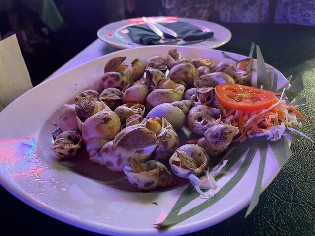 オープンエアのレストランは波の音と遠くに見える灯りに、否応無しに気分が盛り上がる。