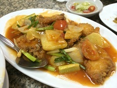 酢豚のような味付けの魚のフライの炒め煮(パットプリオワーン・プラ)