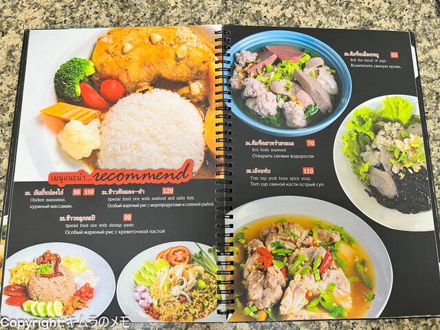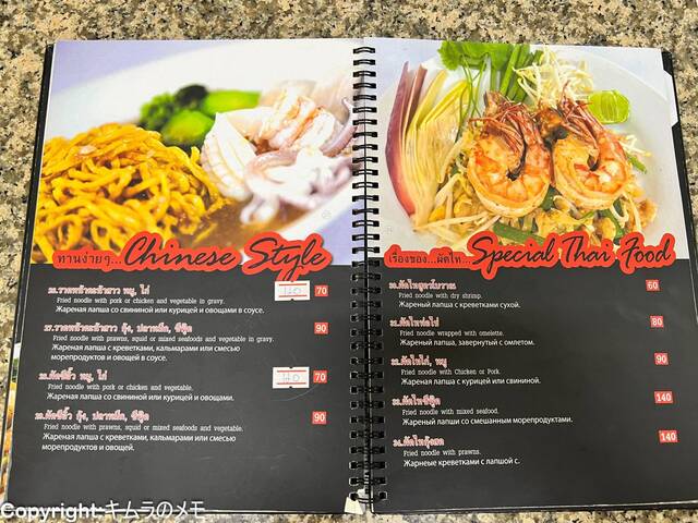 が、日本語表記されているメニューは比較的高級メニューが多く(400バーツ程度)、メニューをペラペラとめくった先にある100バーツ以下の英語表記のローカルメニューをしっかりと見てから決めた方が良い。