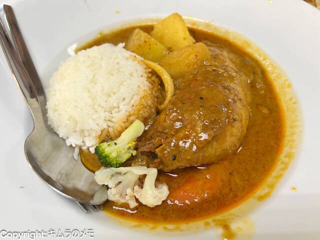 また、モモ肉もホロホロに仕上げられておりしっとりとした食感、肉自体にも味付けがされており、こちらもカレー無しの単品で食べても十分に美味しい。