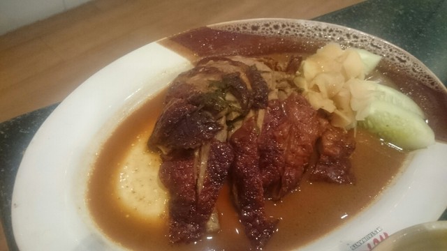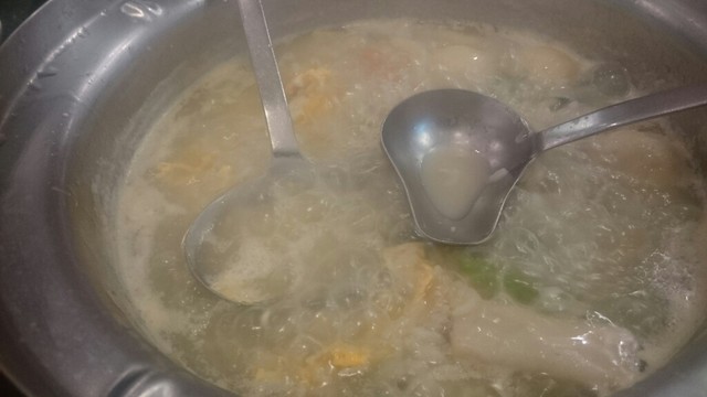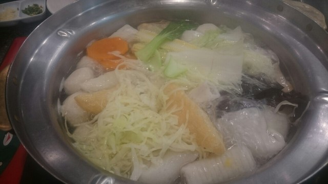 パタヤのセントラルフェスティバルの5階にあります。タイスキのチェーン店で、パタヤにも6店あるそうです。一度は行きたいと思っていましたが、2度は行かないかもしれません。アルコールは、ビールのみです。人数分のセットメニューがあります。鍋以外にも食べたいと思っていたローストダックが入っていますので、割安と思い、頼んでしまいました。多分、割安ではなく、単品の合計と同じみたいです。2人分930バーツのセットは、ローストダック180、ケール炒め90、エビ87、魚団子62、魚春巻59、イカの詰め物67、魚ラグビーボール53、野菜セット小170、グリーン麺53、生卵14、ご飯32、コーラです。とすると、コーラは不要です。全部鍋に投入して、気付いたのは、イカの詰め物がありません。丸いボールが入っています。店員さんに、イカの詰め物を指差して、これが無いと主張すると、追加注文か?と聞かれます。そうではなくて、イカの詰め物がなく、ボールが入っていることは、理解したものの、イカの詰め物が売り切れで、ボールが代わりだと言い出します。ならば、イカの詰め物とボールの価格差分損です。その主張は理解したみたいで、メニューを持って、相談に行ったようですが、梨の礫です。腹たちながら、食べましたが、量が多過ぎて、ローストダック、ケール炒めは半分程度、団子類は、一割程度残しました。雑炊も半分残す感じ。コーラは、飲まずです。味は、まあまあですが、辛さが足りないです。ファミレス風店内は、満席、行列ですが、注文の仕方を失敗するお店です。