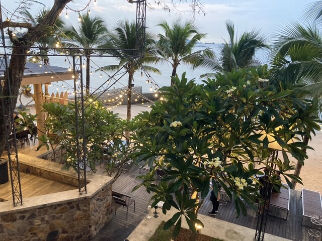 店内に入ると、ビーチまで階段状に席が設けられており、1番下は波打ち際に近いビーチの上。夕暮れ時に訪問したので、ロマンチックな雰囲気。おっさんばかりでは、ちょっと気が引けます。