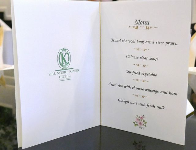 メニューはテナガ川エビ海老の炭火焼き、中華風スープ、野菜炒め、ソーセージ&ハム入り炒飯、銀杏のフレッシュミルク仕立てで以上です。