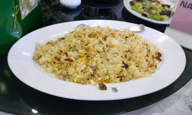 ソーセージ&ハム入り炒飯は山盛り状態で置かれており、適当な量を自分の皿の上に盛りつけていきます。炒飯は米粒はパラパラで、ハムやベーコンの旨味が染み入って食がすこぶる進みます!