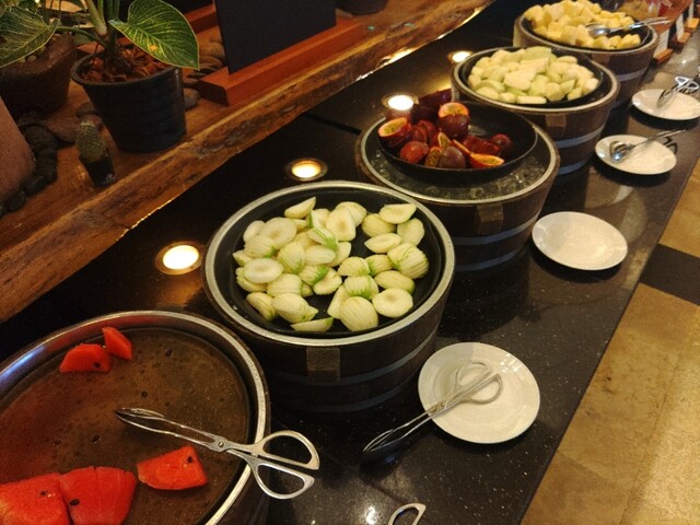 ここでの朝食はビュッフェで内容はウェスタン、タイ料理、インド料理、点心、サラダ、フルーツなど
