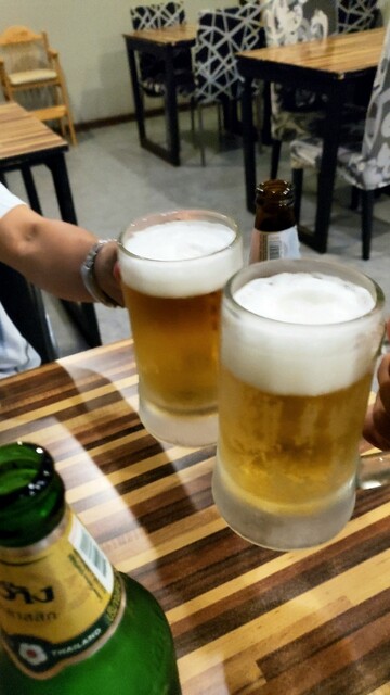 タイビールで乾杯した後、先ずは餃子が登場。所謂、揚げ餃子ですね。ビールによく合います。そして、サーモンやイカ、カマボコ、カニかま、ソーセージ等を酸っぱピリ辛で和えた、イサーン名物ヤム・タレー。注文時に、NOTスパイシーと伝えたけど、かなりの激辛((( ;゚Д゚))) ヒーヒーしながら頂きました。流石は激辛の本場、イサーン!ホテルのレストランでも本格的です(o^-')b !
