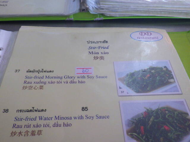 「空心菜炒め」60バーツと「アサリの激辛炒め」100バーツ