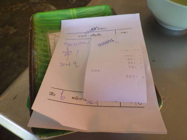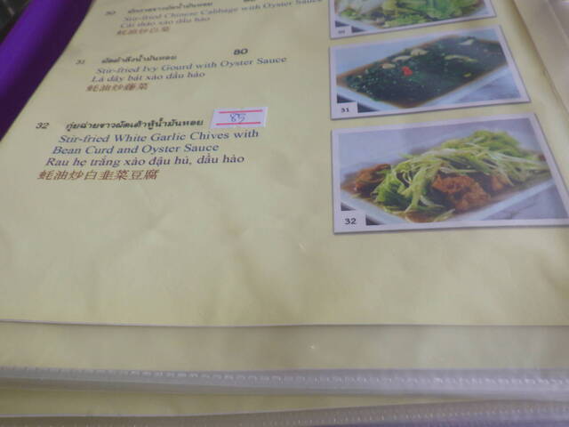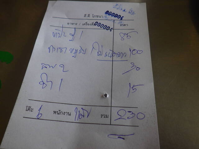 翌日も「ディーディーポーチャナー」でランチをいただきました。「豚のガパオ」100バーツと「黄ニラと揚げ豆腐のオイスターソース炒め」85バーツを注文しました。「豚のガパオ」はバジルの香りと、辛みと、醤油の味付けが絶妙で美味しかったです。「黄ニラと揚げ豆腐のオイスターソース炒め」は辛くなく、黄ニラがシャキシャキしていて香りもよくて美味しかったです。ご飯と氷と水をつけて230バーツでした。