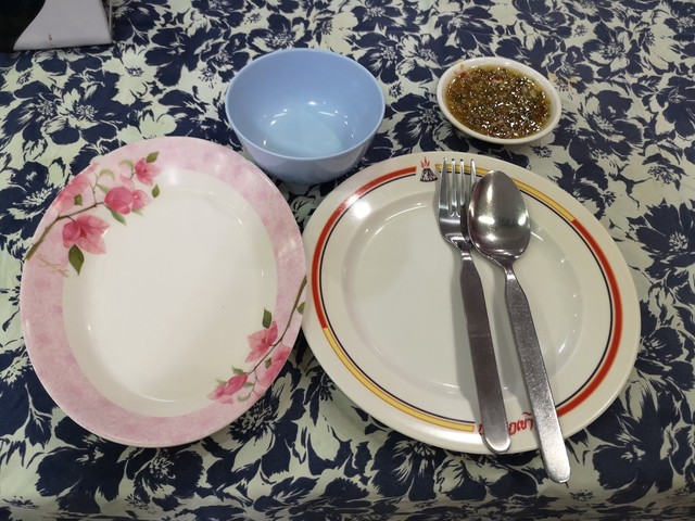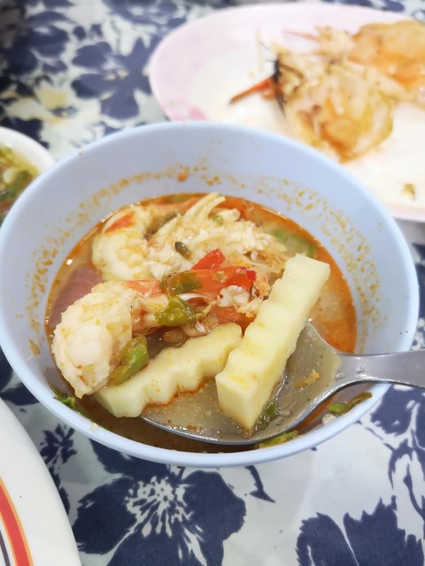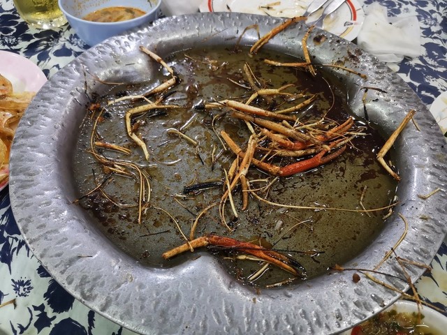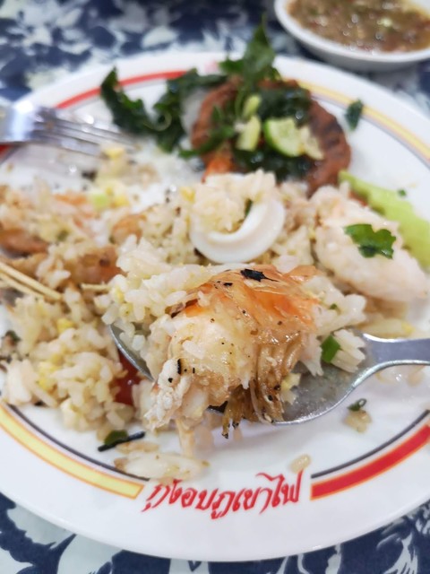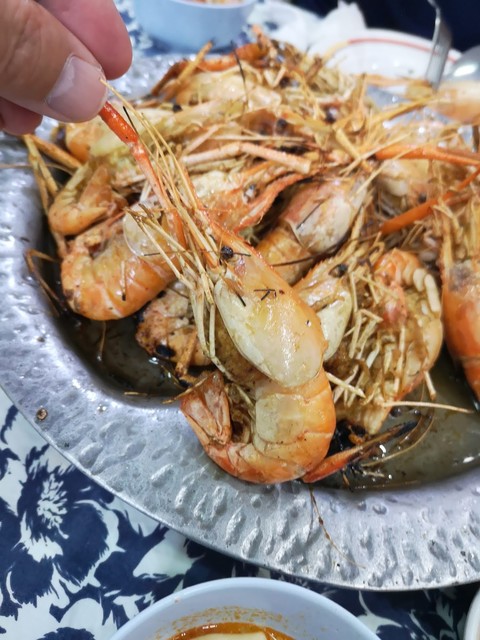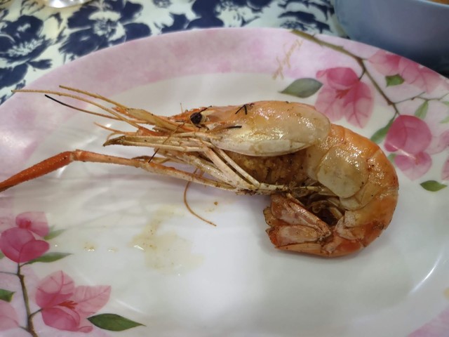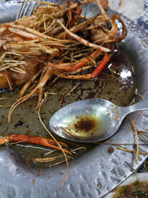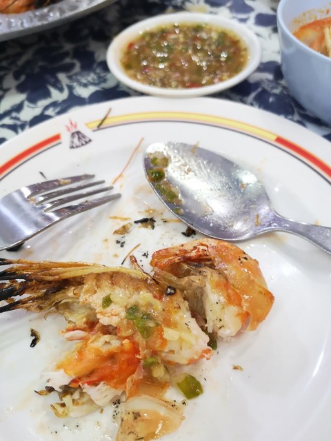 この大量の海老を、タイ式にスプーンとフォークで殻を剥いては食べ進みます。多少剥き残した殻や尻尾、足はカルシウムと思ってボリボリ食べます。身も旨いけど、殻も旨い。